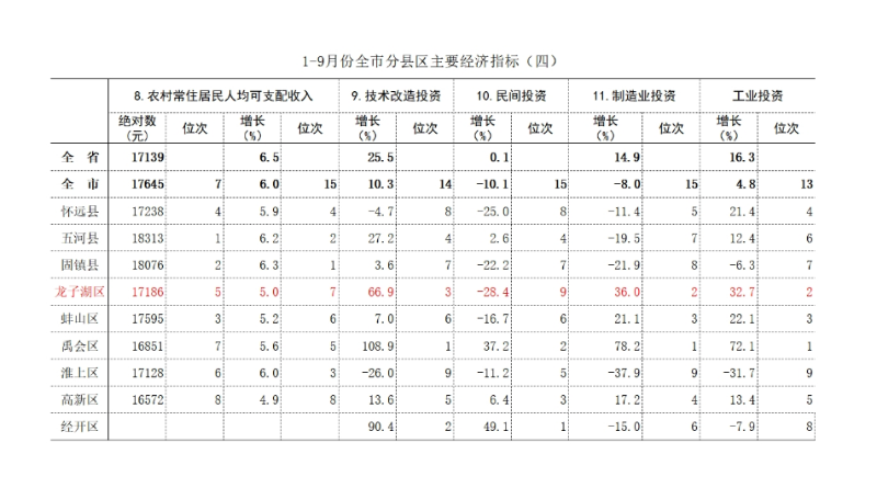 在已經(jīng)反饋的前三季度14項主要經(jīng)濟指標(biāo)中,我區(qū)增長率排名居全市前三的有3個,分別為社會消費品零售總額、技術(shù)改造投資、制造業(yè)投資;4-6位的有4個,分別為地區(qū)生產(chǎn)總值、固定資產(chǎn)投資、城鎮(zhèn)常住居民人均可支配收入一般公共預(yù)算收入;7-9位的有4個,為規(guī)模以上工業(yè)增加值、農(nóng)村常住居民人均可支配收入、民間投資、建筑業(yè)總產(chǎn)值、
