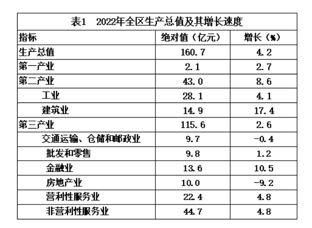 【綜合】 初步核算,全年國內(nèi)生產(chǎn)總值(GDP)160.7億元,增長4.2%。其中,第一產(chǎn)業(yè)增加值2.1億元,增長2.7%;第二產(chǎn)業(yè)增加值43.0億元,增長8.6%;第三產(chǎn)業(yè)增加值115.6億元,增長2.6%。三產(chǎn)結(jié)構(gòu)由去年的1.7:31.9:66.4調(diào)整為1.3:26.8:71.9,其中工業(yè)增加值占GDP比重為17.5%。
