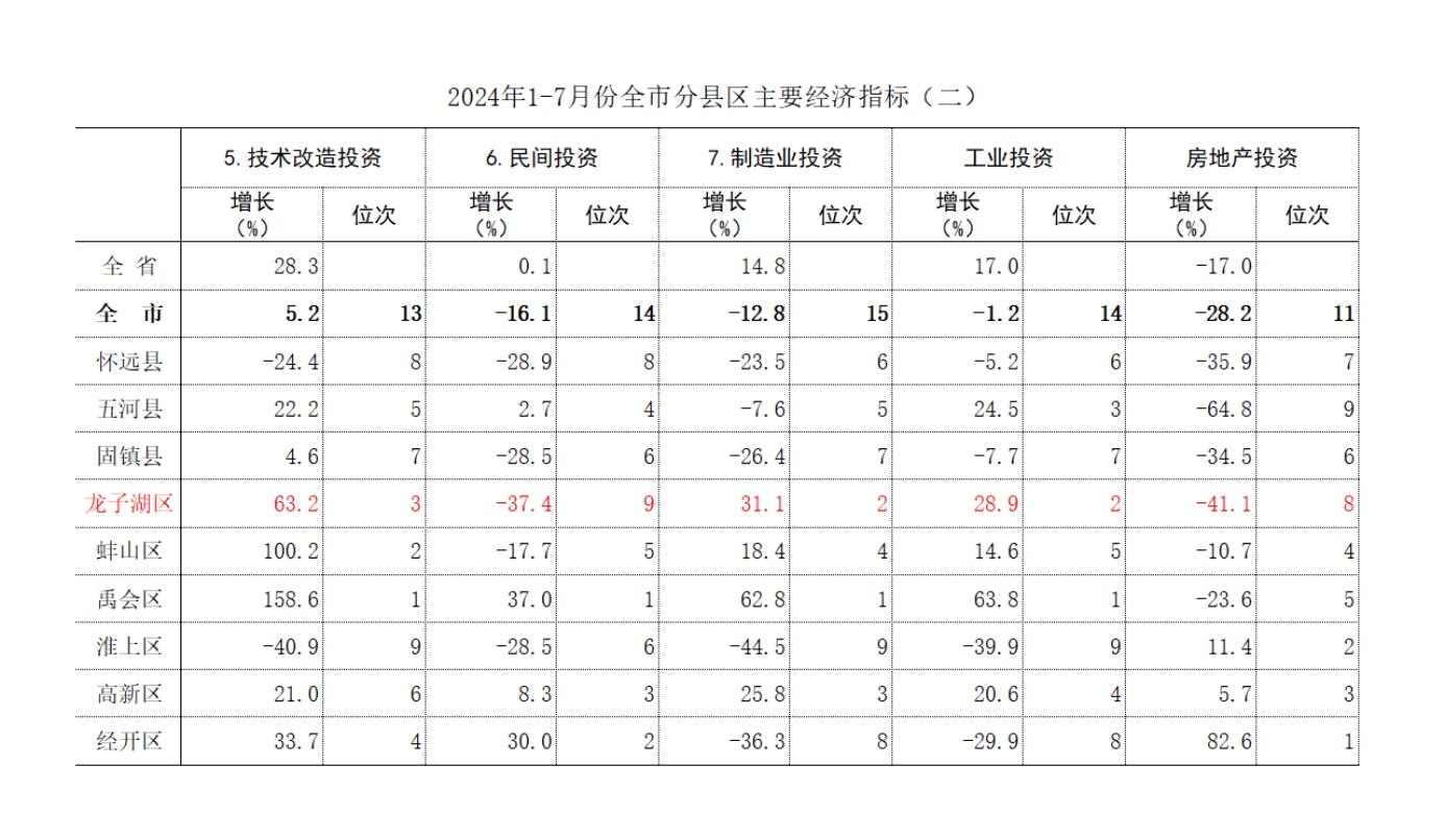 在已經(jīng)反饋的1-7月10項(xiàng)主要經(jīng)濟(jì)指標(biāo)增速中,我區(qū)1-3位的有2個(gè),分別為技術(shù)改造投資、制造業(yè)投資;4-6位的有3個(gè),分別為固定資產(chǎn)投資、限額以上消費(fèi)品零售額、一般公共預(yù)算收入;7-9位的有2個(gè),分別為規(guī)模以上工業(yè)增加值、民間投資。