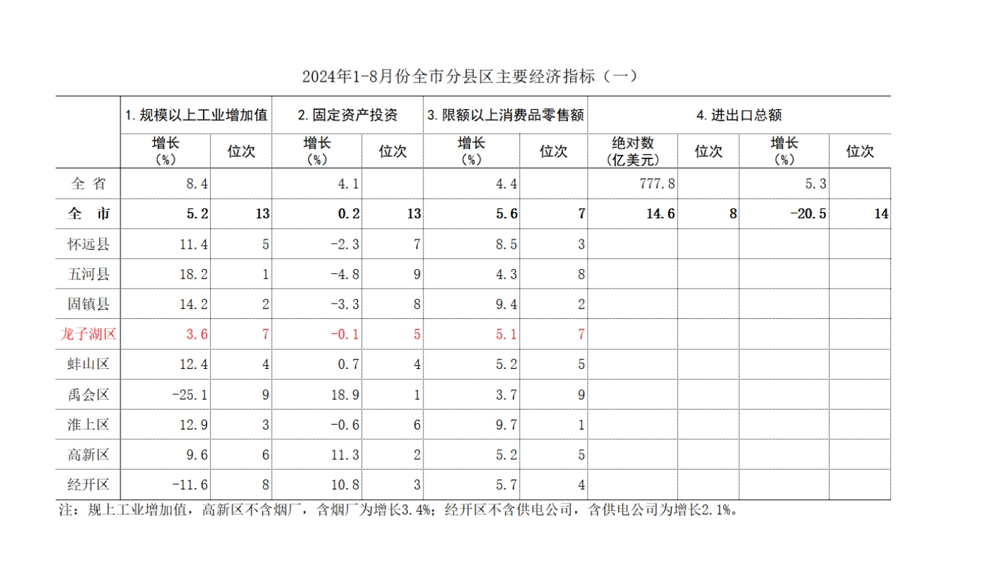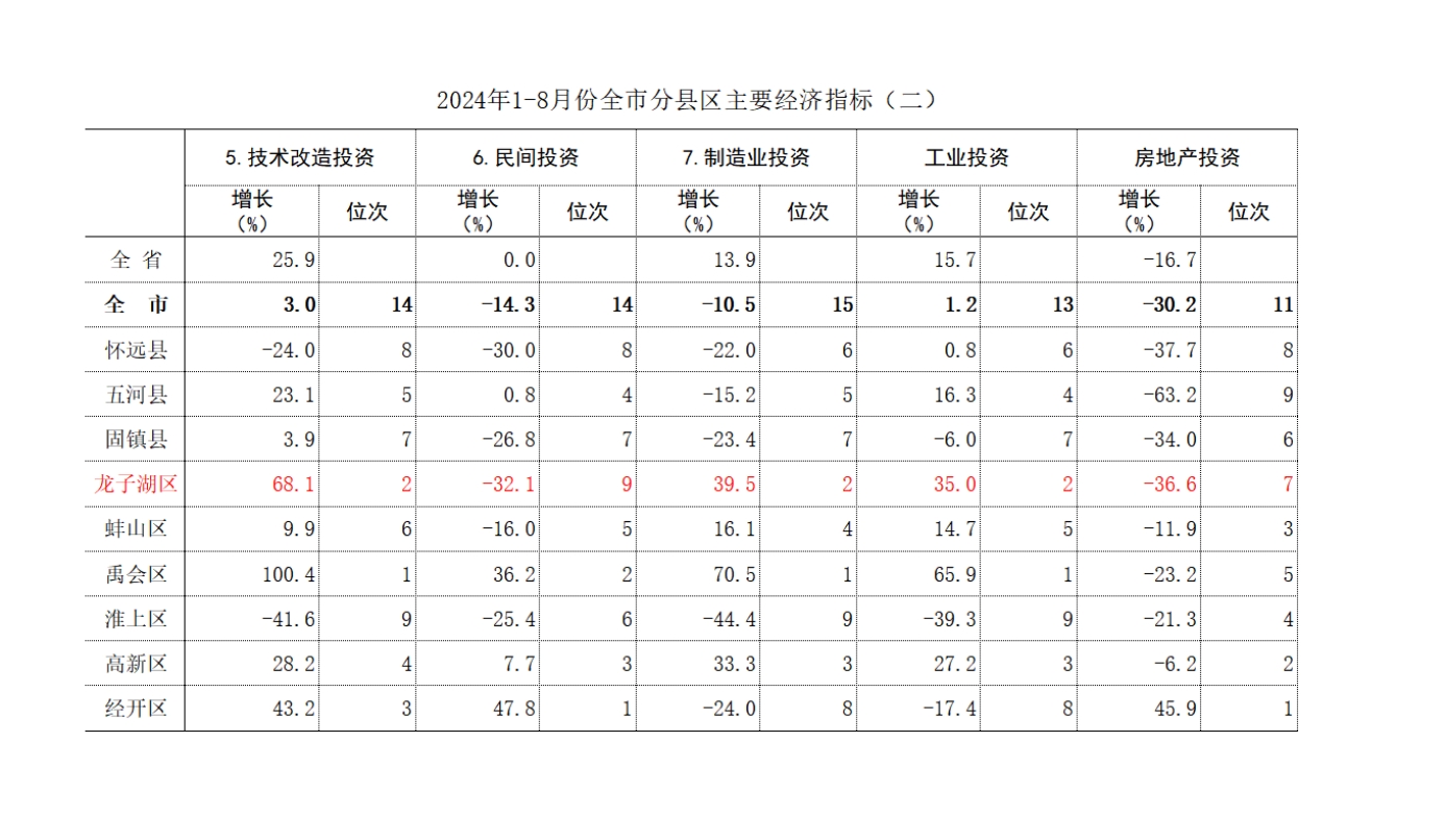 在已經(jīng)反饋的1-8月10項(xiàng)主要經(jīng)濟(jì)指標(biāo)增速中,我區(qū)1-3位的有2個(gè),分別為技術(shù)改造投資、制造業(yè)投資;4-6位的有1個(gè),為固定資產(chǎn)投資;7-9位的有4個(gè),分別為規(guī)模以上工業(yè)增加值、限額以上消費(fèi)品零售額、民間投資、一般公共預(yù)算收入。