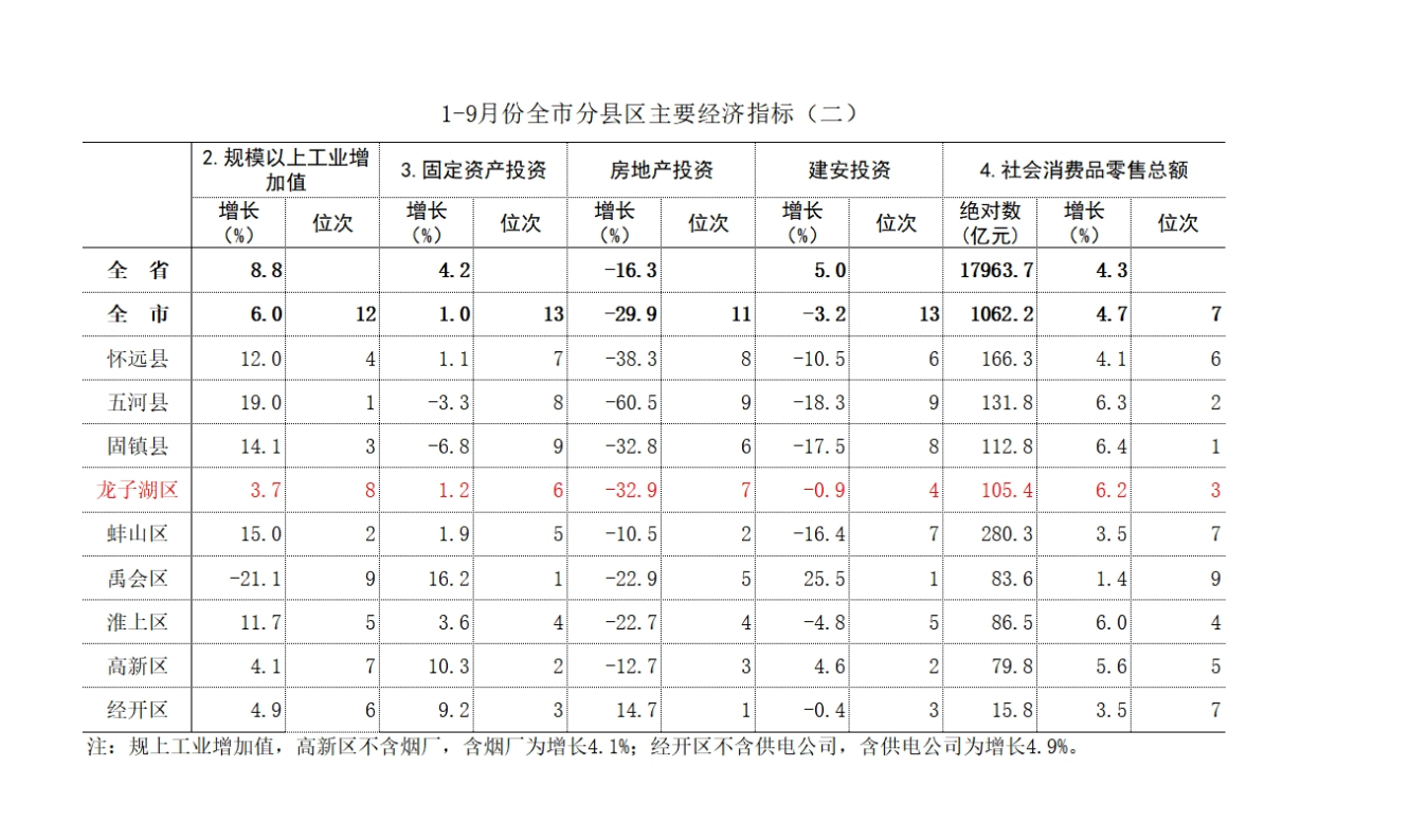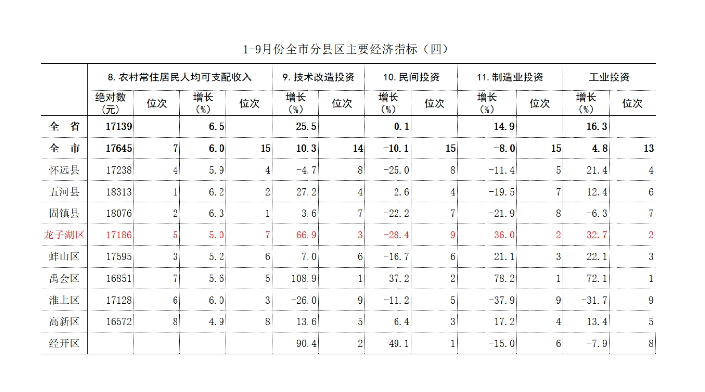 在已經(jīng)反饋的前三季度14項(xiàng)主要經(jīng)濟(jì)指標(biāo)中,我區(qū)增長率排名居全市前三的有3個,分別為社會消費(fèi)品零售總額、技術(shù)改造投資、制造業(yè)投資;4-6位的有4個,分別為地區(qū)生產(chǎn)總值、固定資產(chǎn)投資、城鎮(zhèn)常住居民人均可支配收入一般公共預(yù)算收入;7-9位的有4個,為規(guī)模以上工業(yè)增加值、農(nóng)村常住居民人均可支配收入、民間投資、建筑業(yè)總產(chǎn)值、