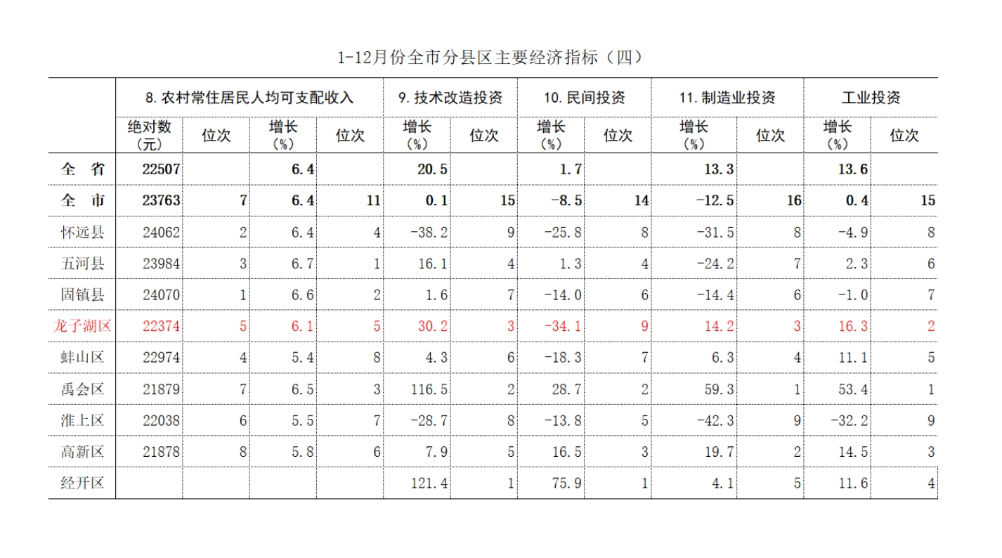 在已經(jīng)反饋的1-12月14項主要經(jīng)濟指標中,我區(qū)增長率排名居全市前三的有3個,分別為社會消費品零售總額、技術(shù)改造投資、制造業(yè)投資;4-6位的有4個,分別為固定資產(chǎn)投資、城鎮(zhèn)常住居民人均可支配收入、農(nóng)村常住居民人均可支配收入、一般公共預(yù)算收入;7-9位的有4個,為地區(qū)生產(chǎn)總值、規(guī)模以上工業(yè)增加值、民間投資、建筑業(yè)總產(chǎn)值。