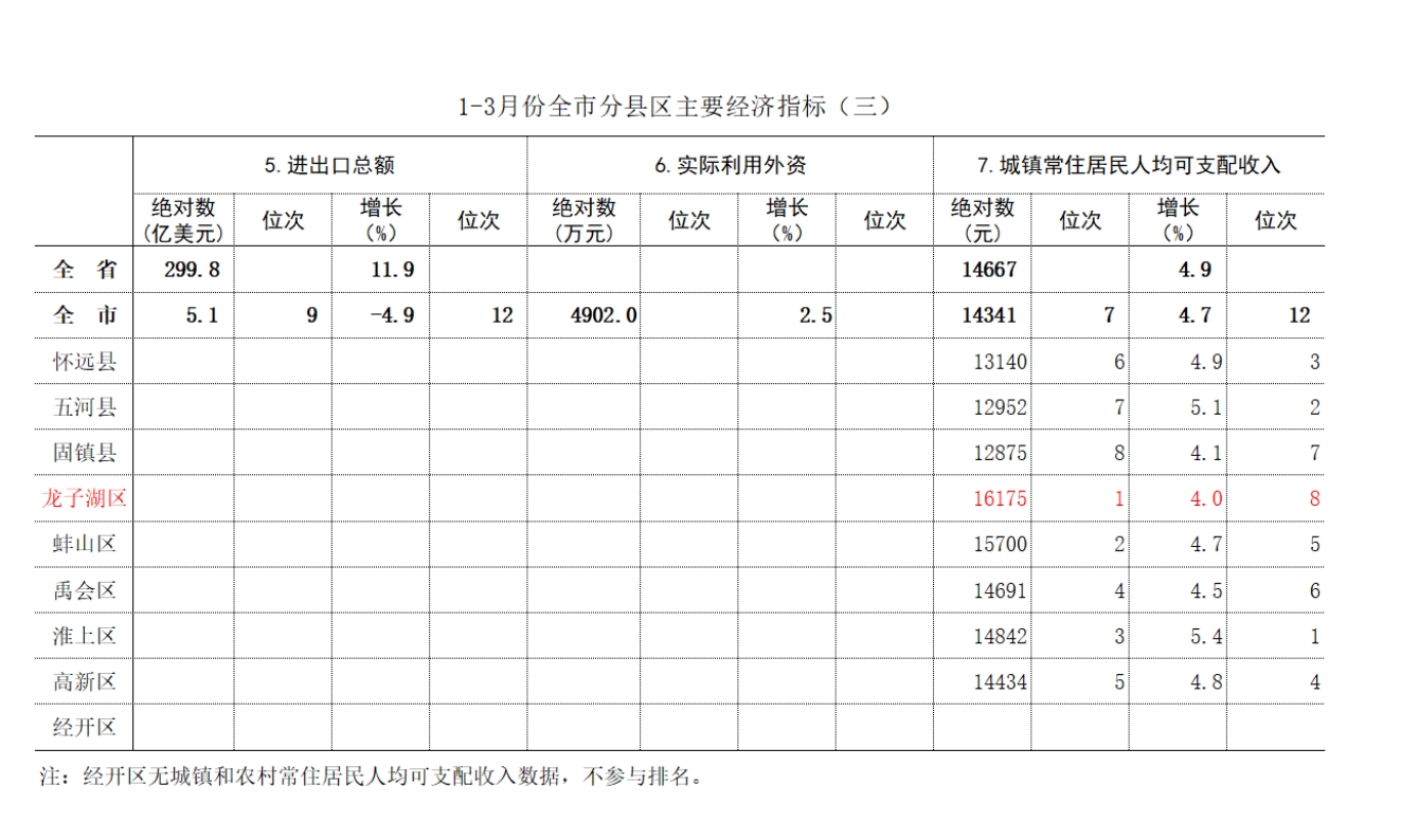 一季度,城鎮(zhèn)常住居民人均可支配收入16175元,居全市第1位;增長(zhǎng)4.0%,低于全市平均增速0.7個(gè)百分點(diǎn),居全市第8位;低于全省平均增速0.9個(gè)百分點(diǎn);較上年同期降低0.2個(gè)百分點(diǎn),后移5位。