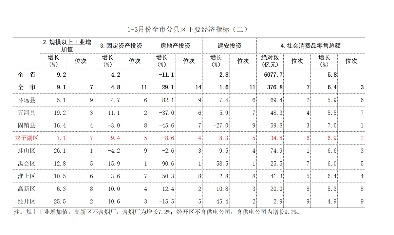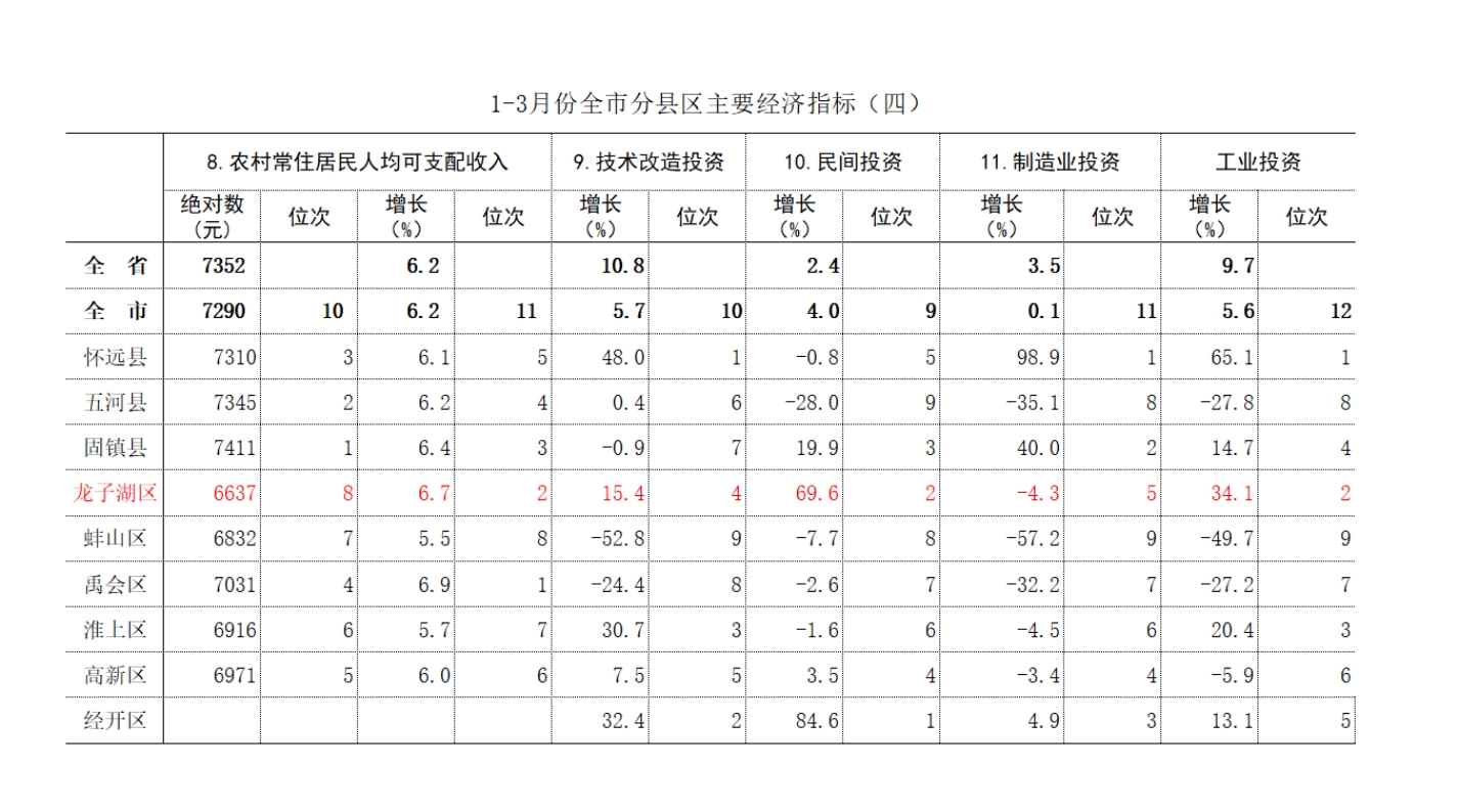 在已經(jīng)反饋的一季度14項(xiàng)主要經(jīng)濟(jì)指標(biāo)中,我區(qū)增長(zhǎng)率排名居全市前三的有3個(gè),分別為社會(huì)消費(fèi)品零售總額、農(nóng)村常住居民人均可支配收入、民間投資;4-6位的有3個(gè),分別為固定資產(chǎn)投資、技術(shù)改造投資、制造業(yè)投資;7-9位的有5個(gè),分別為地區(qū)生產(chǎn)總值、規(guī)模以上工業(yè)增加值、城鎮(zhèn)常住居民人均可支配收入、建筑業(yè)總產(chǎn)值、一般公共預(yù)算收入。