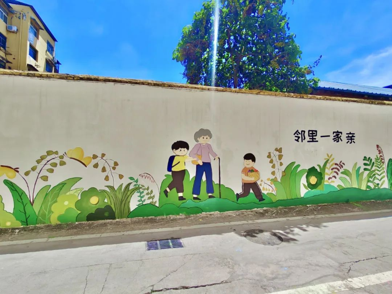 如今,這面文化墻不僅成了小區(qū)居民駐足觀賞的“風(fēng)景線”,還成了促進鄰里交流的“催化劑”。傍晚時分,常有居民帶著孩子來散步,指著畫面對孩子說:“你看,要像畫里那樣,主動幫助別人呀。”不少居民說,“現(xiàn)在下樓遛彎,看到墻上的畫,碰到鄰居都會多聊幾句了。”