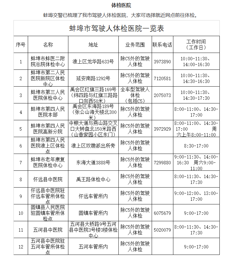 蚌埠交警已梳理了我市駕駛人體檢醫(yī)院,大家可選擇就近網點前往體檢。