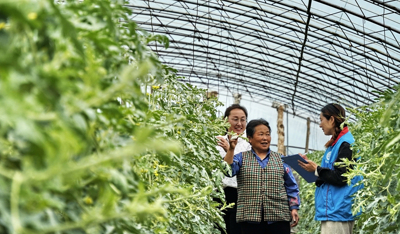 北京市大興區(qū)龐各莊鎮(zhèn)李家巷村政務(wù)服務(wù)站的工作人員來(lái)到大棚內(nèi)為瓜農(nóng)辦理社保業(yè)務(wù)(2024年4月9日攝)。新華社記者 李欣 攝